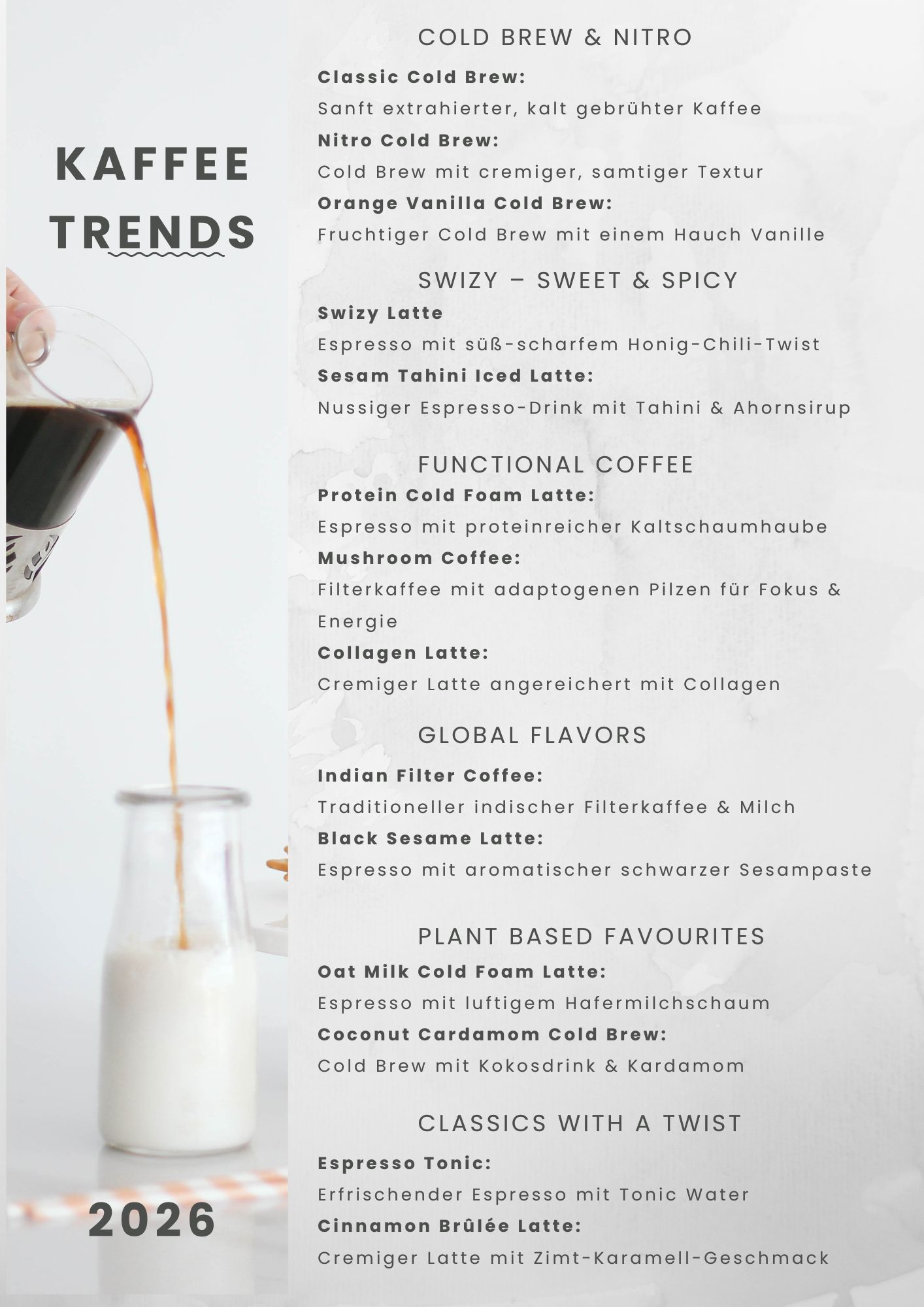 Klar, der erste Kaffee am Morgen ist und bleibt auch im Jahr 2026 oft ein duftender Kaffee aus dem Filter oder Cappuccino aus dem Siebträger oder Vollautomaten. Für unser Wohlbefinden ist vor allem der Wachmacher Koffein wichtig, der uns den Kickstart in den Tag gibt. Für die Kaffeepause tagsüber sieht das schon wieder ganz anders aus – hier sind wir aufgeschlossen für Experimente und neue Geschmackserlebnisse.
